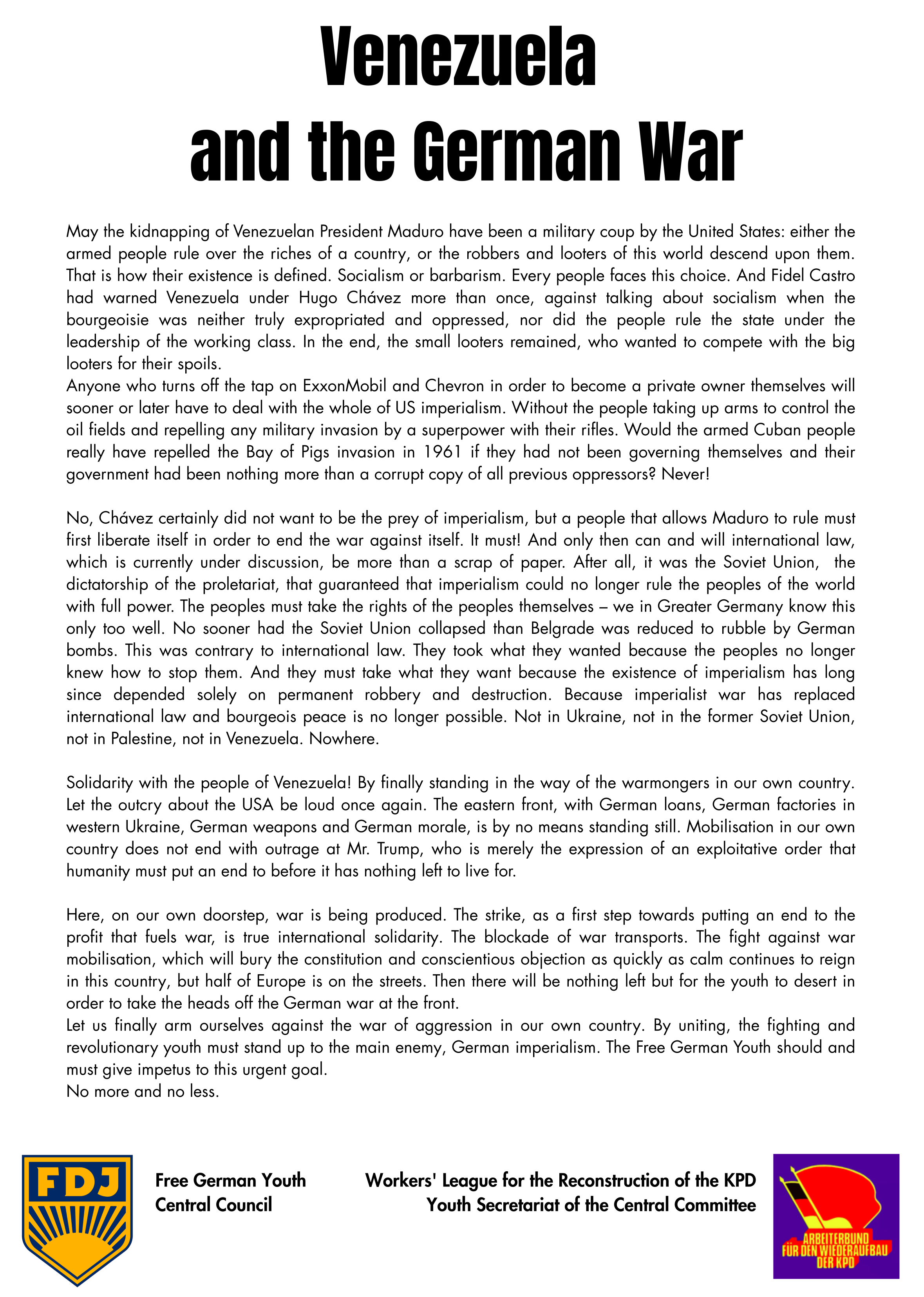 The so-called post-war order is declared to be over. For the first time since the Second World War, a war is waged which is wanted, pushed and led by the FRG. This new set-up, made possible by the collapse of the socialist camp and the West German annexation of the GDR, shakes the delicate web of contradictions between the imperialists. Once again, a third world war and barbarism threaten.